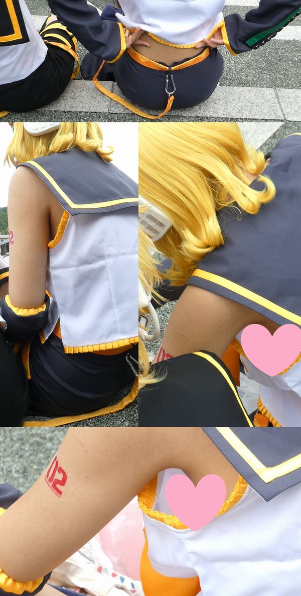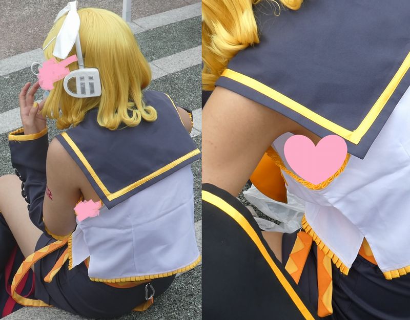 友人のコスプレイヤーと二人で座って雑談中のところを背後から忍び寄り、ゆっるゆるの脇を狙いました。