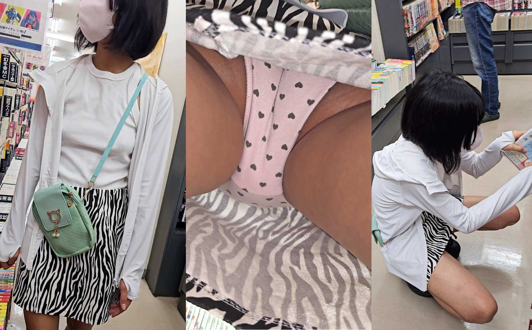 スカートの中を覗くと可愛いパンツが。座ったときに太ももが見え、上から見たらワンチャン見えるかなと思ったら、、。えちえち若いこですね。