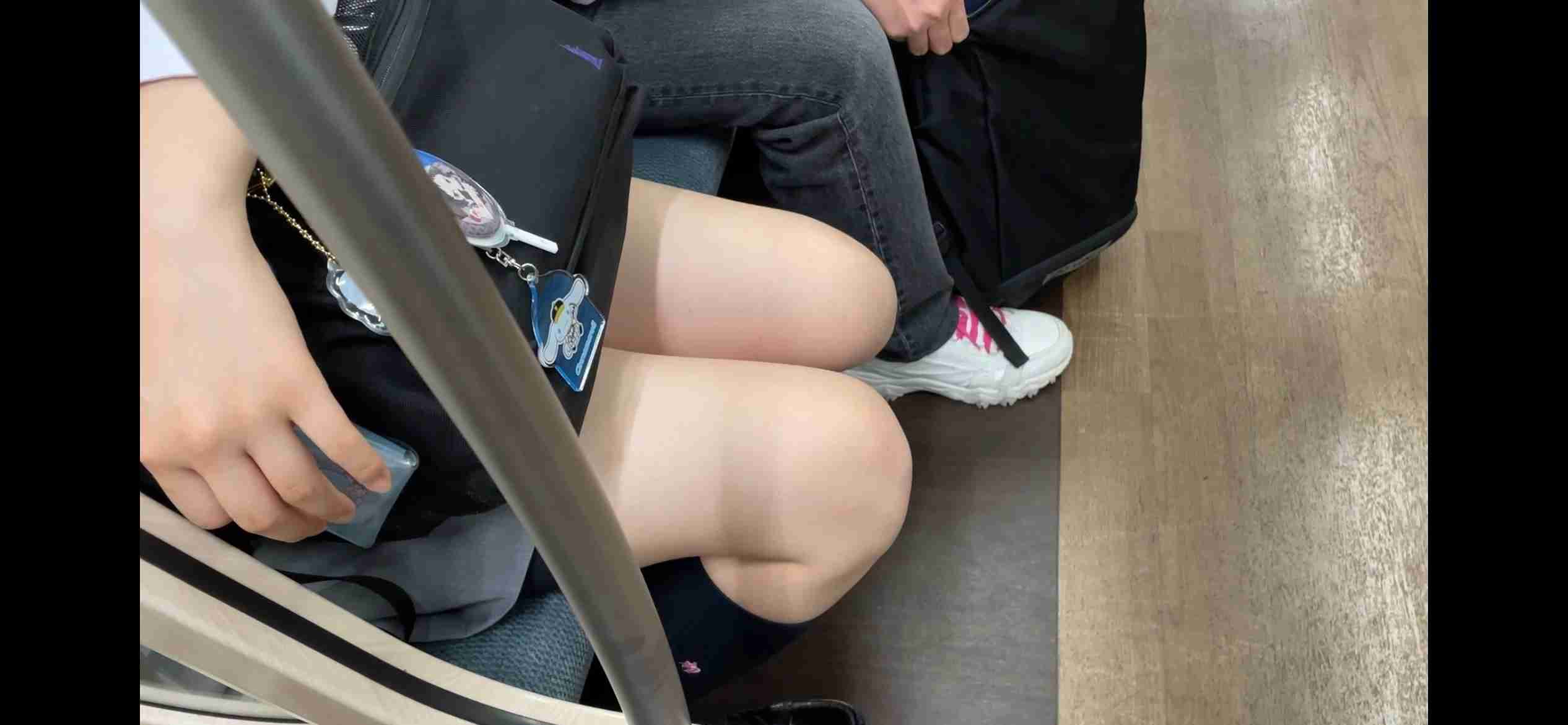 ①2人組で並んで座っています。手前のモデル系脚長美脚の太ももにフォーカスしています。絶品でしたねー