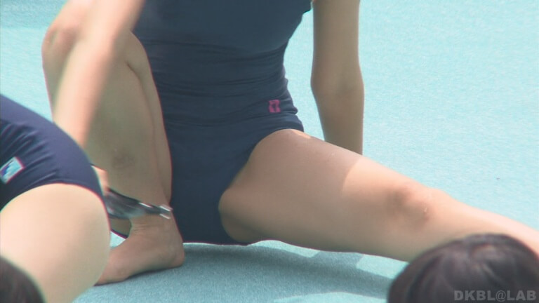 珍しく練習中のちゃぷちゃぷシーンからスタート。いつものように片道泳ぎ片道回送。今回はひれをもたずにプールサイドを回送。ピュアな水着姿をじっくりとお楽しみいただけます。おしゃべりしながら優雅にプールサイトを闊歩中、つまずいてびっくり!「その瞬間」を見ていた娘に「見ないでよー」と言っているかわいいショットも。日差しが薄く見られている感がないのか今回は食い込み放置娘が多い感じ。