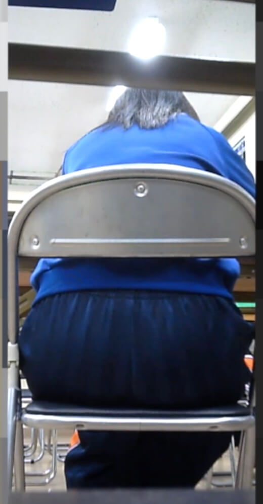 図書館の自習スペースにて巨尻学生です。腰までは細くてケツだけボン!と膨らんでいます。若い娘なので、上は学校指定のジャージです。