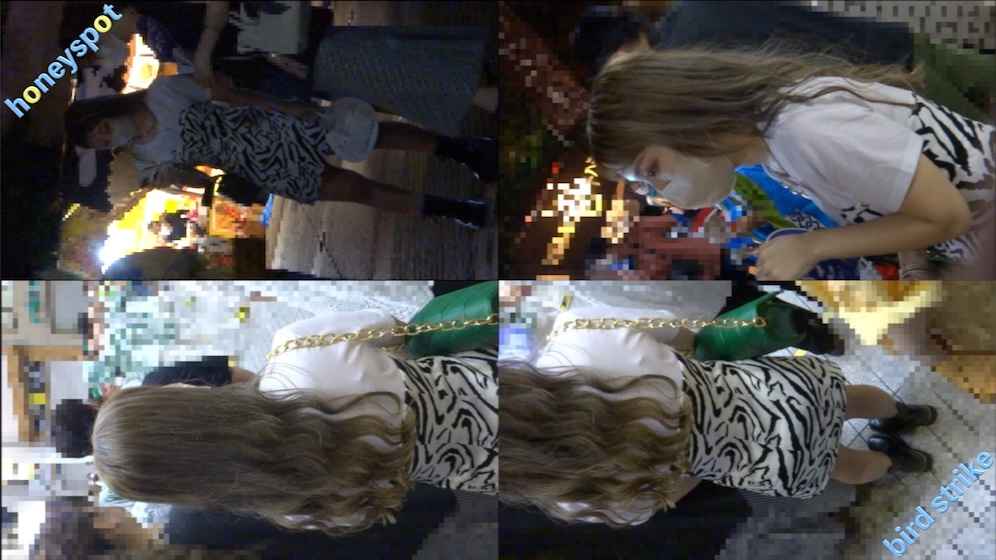 斜め掛けしたバッグがスカートを持ち上げ横からの逆さでフ