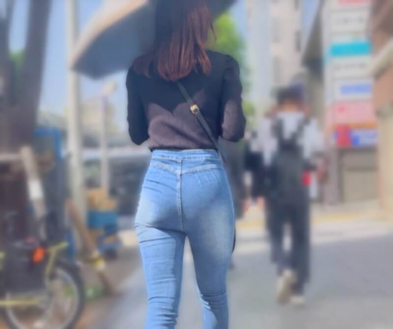 早速背後に近づくと、見ての通り歩く後ろ姿の時点でもうイケてるオーラ全開であり、それもそのはず身長は168cm前後はある長身に加えて、スキニーデニムとブーツというクールでイヤらしいファッションセンスも印象的です。