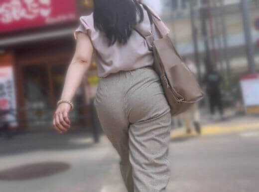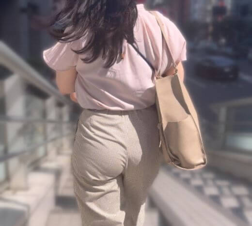 早速背後に近づくと、身長は160cm前後と平均的で爽やかなピンクのブラウスやベージュ系のスラックスが非常に似合っていて色白の肌にもマッチしています。