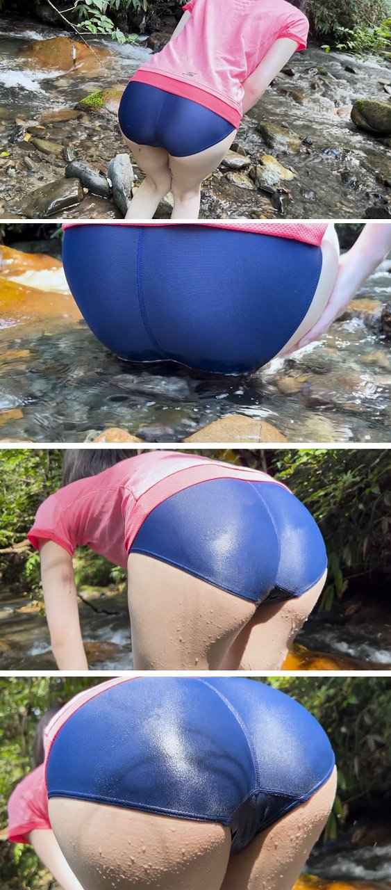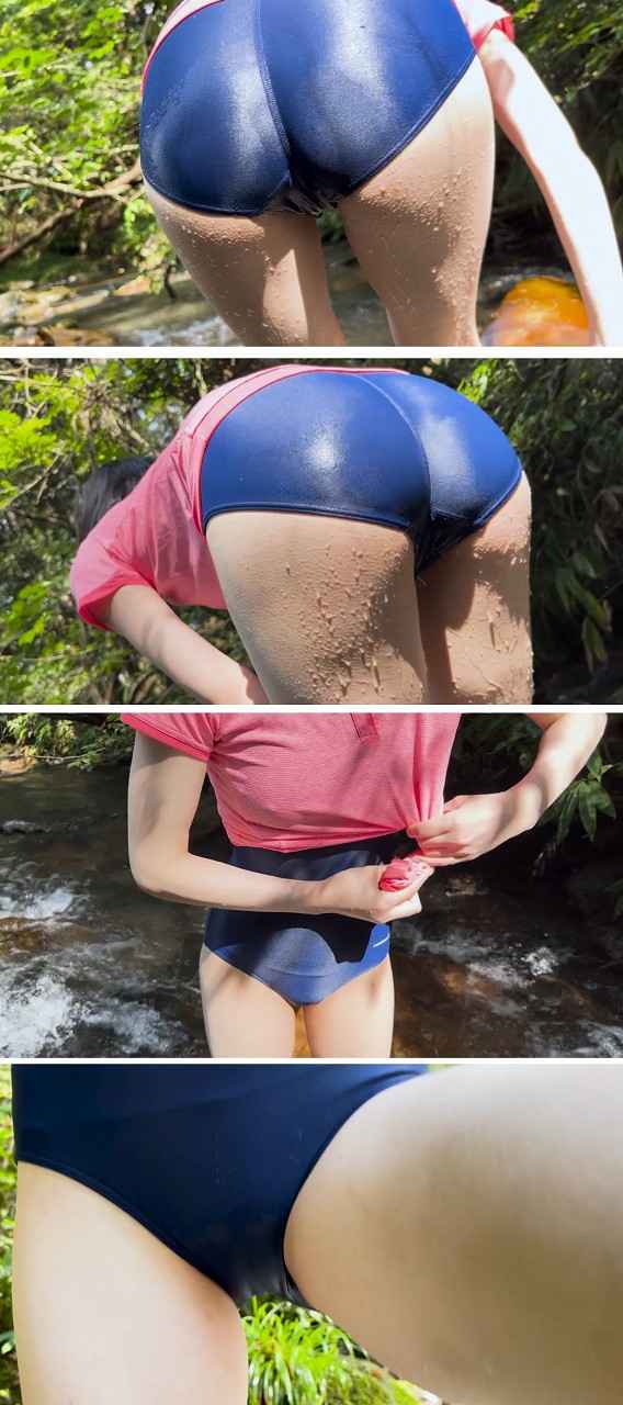 お尻を水につけ、濡れたスク水のお尻が太陽に照らされて輝いています。
