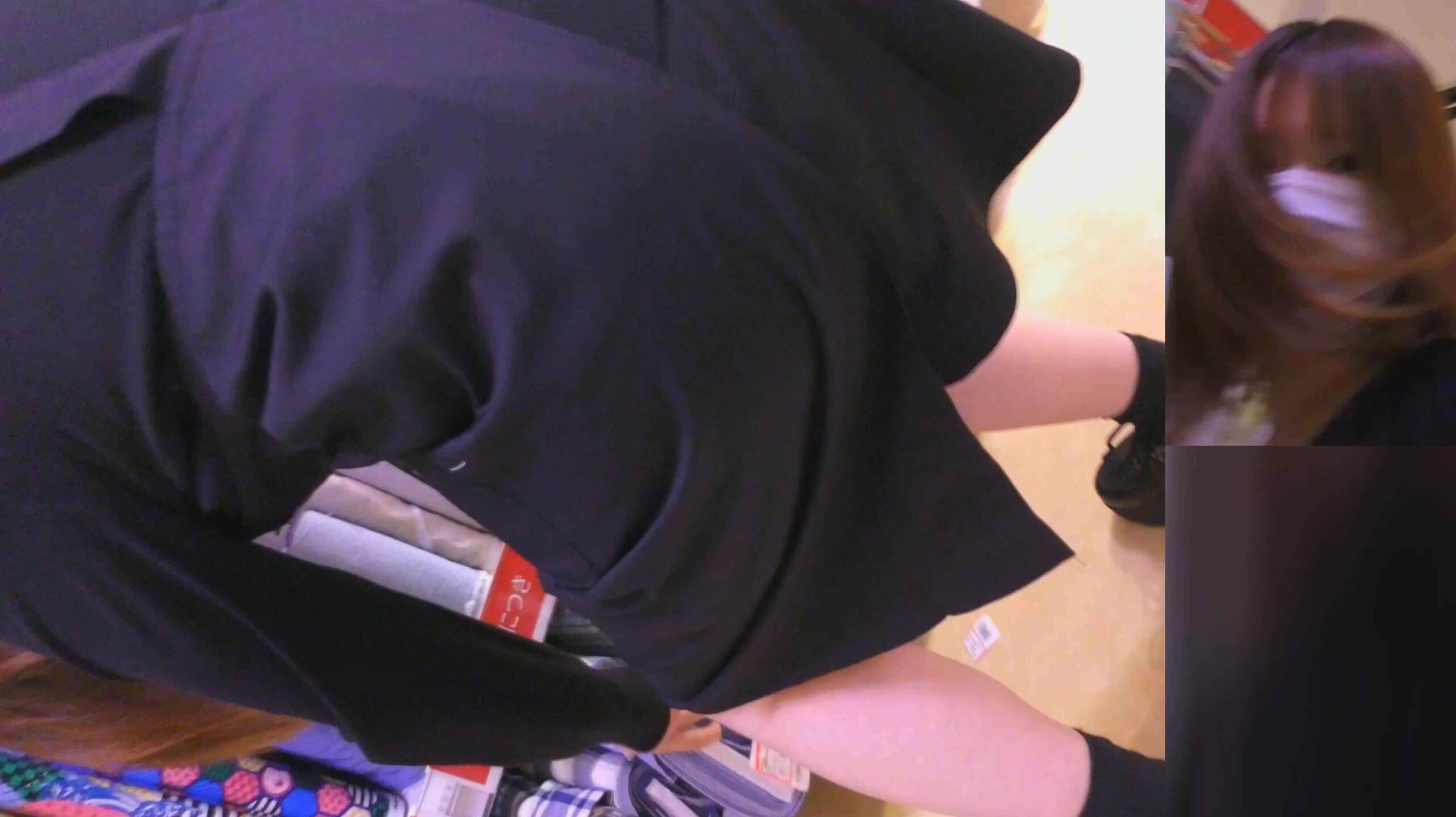 一つ目の商品を戻す際に中腰ではなくしゃがまれたので、横から頂きました。こんなの履いて接客するって何考えてんでしょうね。そりゃ撮られます。