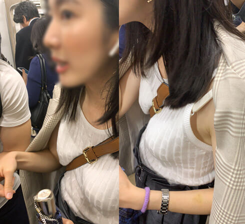 乗客同士のカラダが密着するような混んだ電車に乗っていると丁度目の前に外国人と日本人美女のカップルを発見。