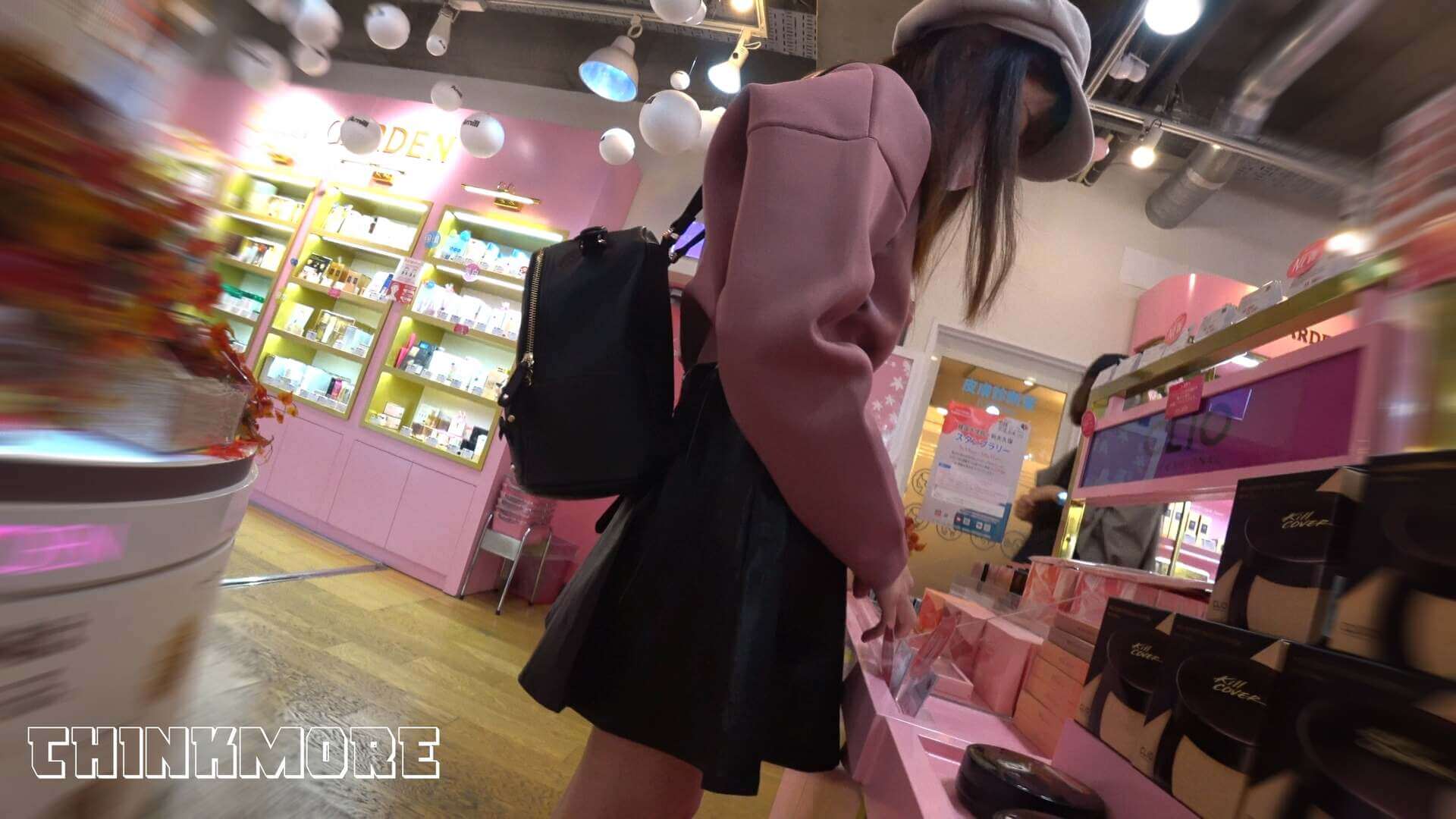 今回の子も黒のミニスカートを履いていたので、「どうせインパン付きのものだろうな~。脚が細いから隙間チラでも狙えれば良いかな~。」なんて感じで期待せずに飛行するとまさかの生P。まあいつも通り執拗になりますよね。人通りも多く、店舗も狭い店や階段のある場所が多いため、モデルさん自身も警戒心が薄く、いい感じの撮れ高になったと思います。