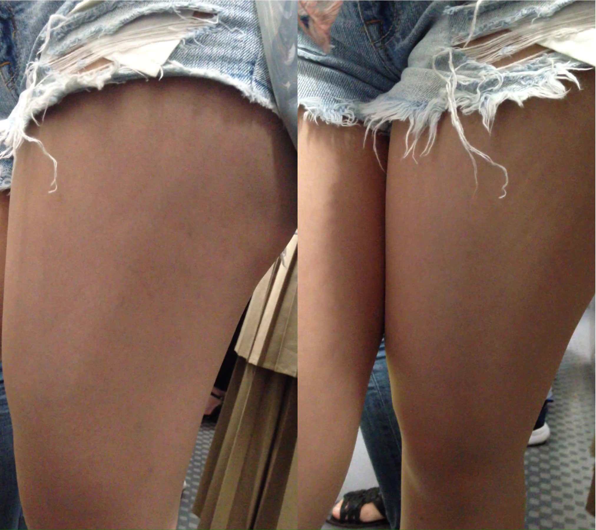 電車で駅で、ローアングルで。ショーパンからたっぷり露出されたど迫力で下品な下半身をねっとりと観察♥